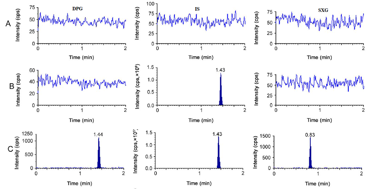 Fig. 3: Typical chromatograms of DPG, SXG and IS in A) Blank plasma, B) Blank plasma spiked with IS and C) Spiked with LLOQ level