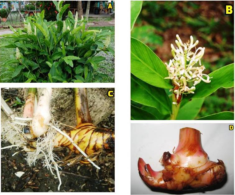 Fig. 1: (A) Whole plant of Alpinia galanga (B) Flower of Alpinia galanga, (C) Rhizome of Alpinia galanga (D) Dried rhizome of Alpinia galanga, @ tropical plants database, ken fern tropical the ferns info. 2019-01-12