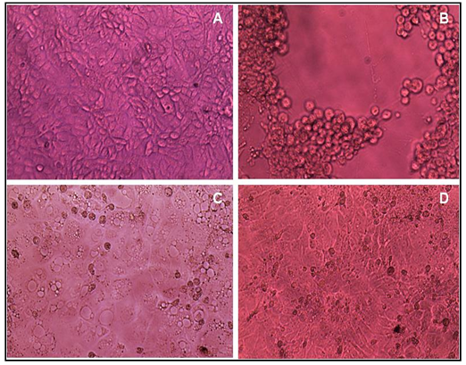 Fig. 1: Cytotoxicity and cytopathic effects on Madin-Darby Bovine Kidney cells (x100) after addition EO, EE and EA of Thymus capitatus before infection with 103 Tissue Culture Infective Dose (TCID) 50 % ml-1Bovine herpesvirus type 1 (BHV-1). A: Cells control, not infected by BHV-1, after 72 hours of incubation. B: Virus control (cytopathic effect), untreated MDBK cell culture, 72 hours after BHV-1 infection with 103TCID50 ml-1. C: Cytotoxic effect, MDBK treated with extracts of EO of T. capitatus (10 µg ml-1), 72 hours of incubation. D: Viral inhibition, MDBK cells were pre-treated with EO (2 µg ml-1) for 2 h, and then infected with BHV-1 at 103 TCID50 ml-1