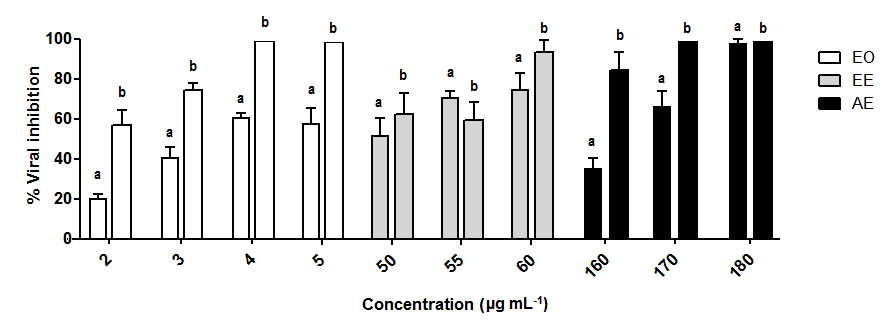 Only non cytotoxic and antiviral concentrations of each plant extract below the MNTC (EO: 2, 3, 4 and 5 µg ml-1; EE: 50, 55 and 60 μg ml-1 and AE: 160, 170 and 180 µg ml-1) were tested to assess anti-BHV-1 activity.