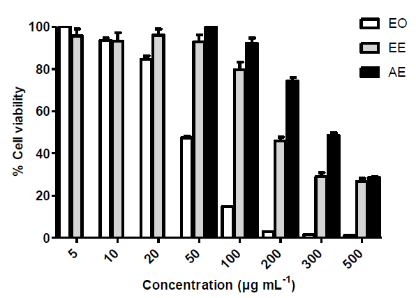 To examine the effect, T. capitata extracts on the growth and the viability of cultured cells, EO, EE and AE were serially diluted and added to the cell culture medium (fig. 1A).