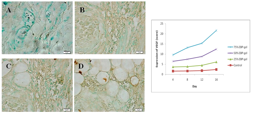 Immunohistochemical analysis expression of VEGF, a marker of vascular endothelial cell, showed that there was a statistically significant increase in the number of new capillary sprouts in the three EBP gel treatment groups compared with the control groups. Expression of VEGF in 50% EBP gel was 4.37 ± 1.11 and 75% EBP-gel was 6.56 ± 0.51 compared with control group was 1.81 ± 0.62 on day 12 (fig. 2).
