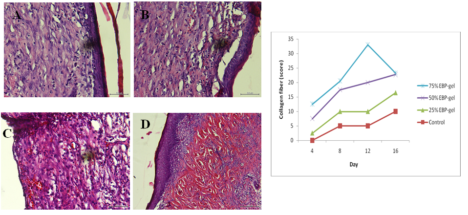 Masson trichrome staining and histological evaluation showed correlation between macroscopic and microscopic appearances of wounds. Masson trichrome staining showed that wounds developed vascular granulation tissue tended to be populated with inflammatory cells and fibroblasts, and partially formed newly formed epithelium at the edge of the wounds in all of the three groups at day 12 after wounding. At day 12, there was thicker and more highly organized collagen fiber deposition, populated with less inflammatory cells and more fibroblasts, in wounds treated with EBP, especially in gel 75% EBP group.