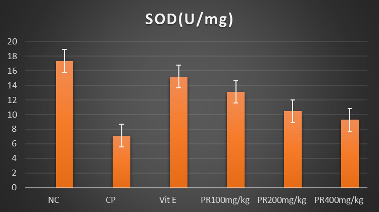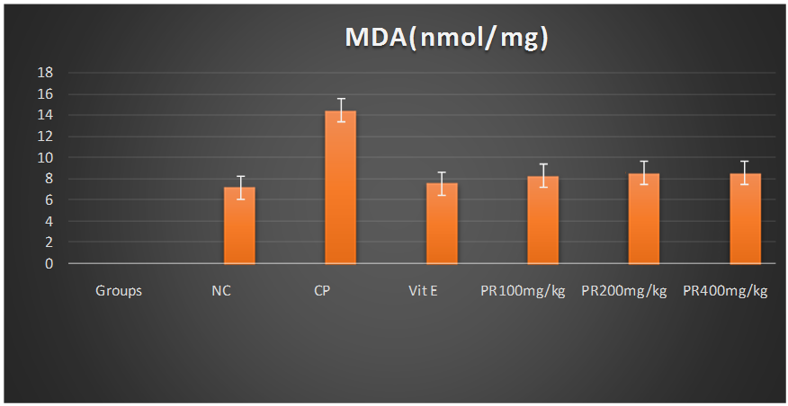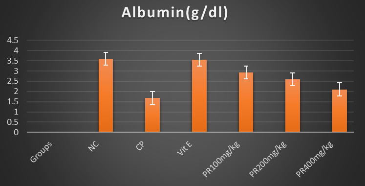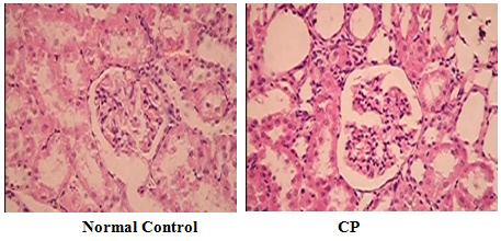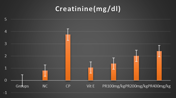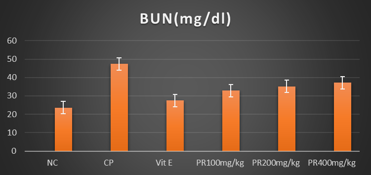 Serum creatinine was significantly (p<0.001) elevated in the CP group when compared to control group. HAEPR treatment (100,200 mg/kg) and Vitamin E (250 mg/kg) significantly (p<0.01) decreased the serum creatinine levels as compared to the CP group. CP group exhibited significant (p<0.001) decrease in albumin when compared to control. Significant (p<0.01) increase in the serum albumin level was found when compared to the CP group by HAEPR (100,200 mg/kg) and Vitamin E (250 mg/kg) treatment. Serum BUN level was significantly (p<0.001) elevated in the CP group compared with control group. HAEPR (100,200 mg/kg) significantly (p<0.01) decreased the serum BUN level as compared with the CP control group. HAEPR (100 mg/kg) was comparable to that of the standard group. Significant (p<0.001) decrease in the activity of SOD was observed in the CP group as compared to control. HAEPR (100 and 200 mg/kg) significantly (p<0.01) increased SOD level when compared to the CP group. HAEPR (400 mg/kg) significantly (p<0.05) increased SOD levels. Significant (p<0.001) increase in the activity of MDA was observed in the CP group as compared to control. HAEPR (100,200,400 mg/kg) significantly (p<0.01) decreased MDA levels as compared to the CP group. HAEPR (100 mg/kg) exhibited results similar to that of std Vitamin E.