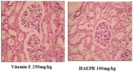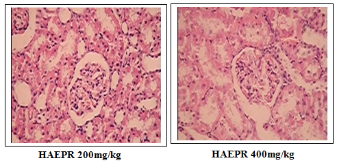 Methods: HAEPR was administered orally at 3 dose levels (100,200,400 mg/kg). Vitamin E (250 mg/kg) was used as a Standard nephroprotective agent. The kidney function test (estimation of serum creatinine, albumin, blood urea nitrogen) oxidative stress study (estimation of superoxide dismutase, malondialdehyde activity) and histological examination of kidneys was conducted.