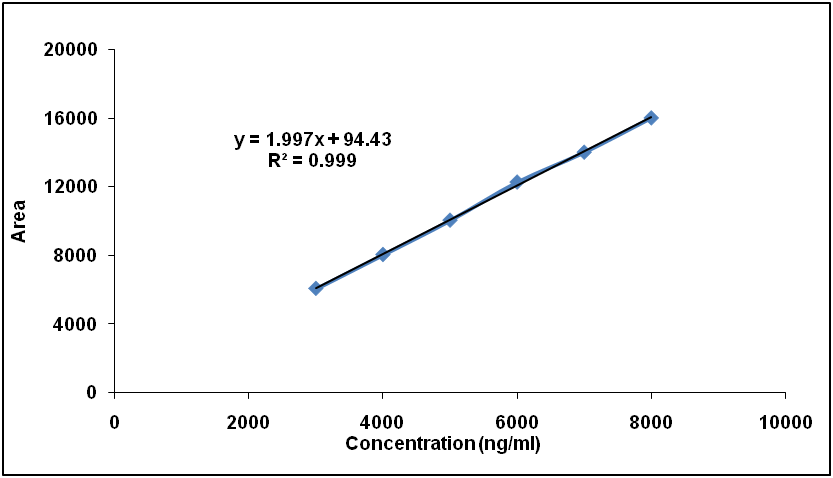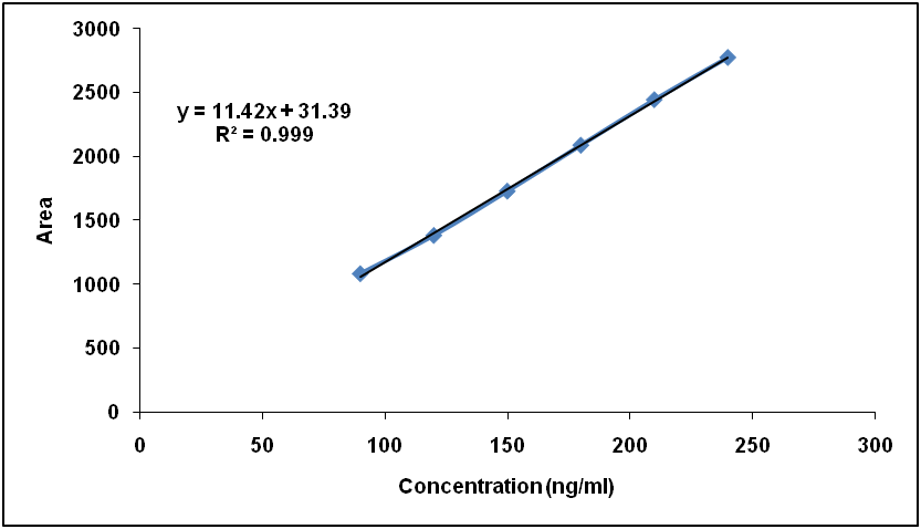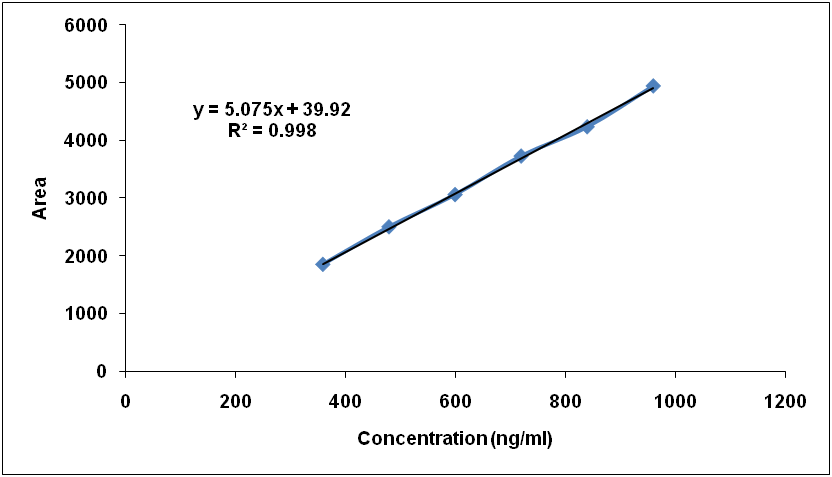 A good linear relationship was obtained over the concentration ranges 200-1000, 360-960 and 90-240 ng/spot for MET, GLZ and PIO respectively. The linear regression data showed a regression coefficient of 0.9993 for MET (fig. 6), 0.9987 for GlZ (fig. 7) and 0.9993 for PIO (fig. 8). The LOD with signal/noise ratio was found to be 357.7, 150.24 and 61.745 ng/spot for MET, GLZ, and PIO respectively. The LOQ with signal/noise ratio was found to be 1084.0, 455.27 and 187.105 ng/spot for MET, GLZ, and PIO respectively.
