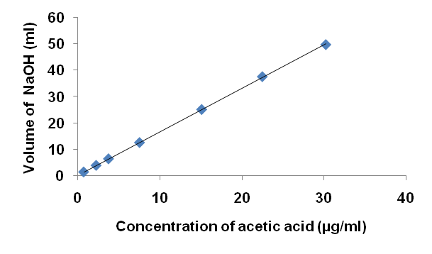 Fig. 2: Linearity plot of the proposed method between the concentration of acetic acid (µg/ml) and volume of