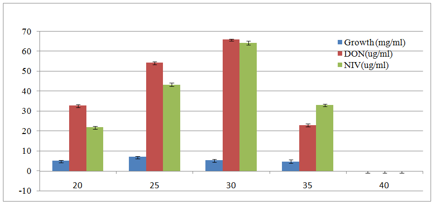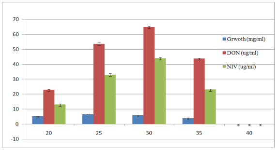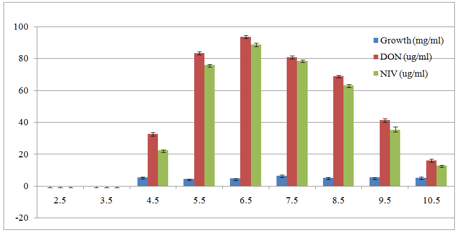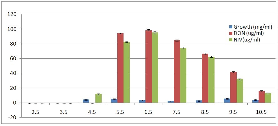 Different pH influenced the mean growth of F. aethiopicum 3.074mg/ml, DON 44.59µg/ml and NIV 41.33µg/ml was recorded. However, mean growth of F. culmorum 4.03mg/ml, DON 46.30µg/ml and NIV 41.79µg/ml was recorded significantly. A positive correlation between growth [0.809], DON [0.962] and NIV [0.991] production was recorded by F. aethiopicum and F. culmorum.