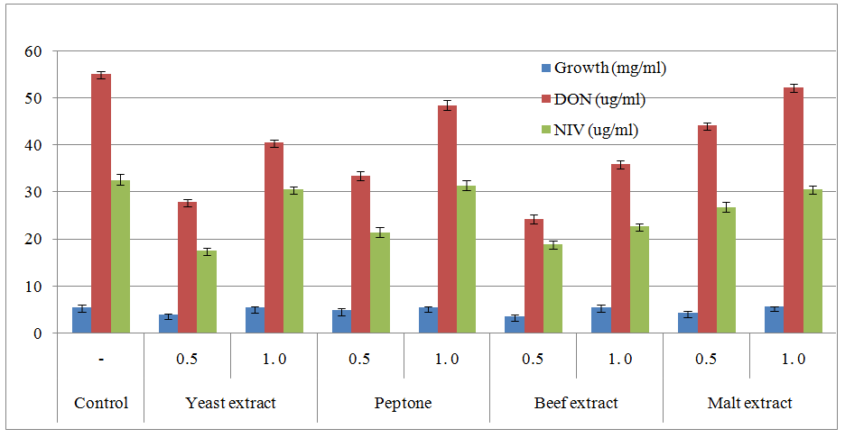 In contrast 1% yeast extract added to the medium stimulated the DON and NIV production, which further increased with the increase in its concentration. Malt extracts also responsible for stimulation of DON and NIV production comparatively at higher concentration. Previous studies by Cabanes et al. [24] reported that A. carbonarius isolates produced maximum OTA on unmodified yeast extract sucrose agar and Czapek yeast agar after about 14 days although some were detected after 7 days with a subsequent decrease over time. Influence of microbial nutrient varied both with species are agreement with Narsimha Rao et al. [19]. Koteswara Rao et al. [20] have also recorded influence of varied microbial nutrients on growth and OTA production by Penicillium species.