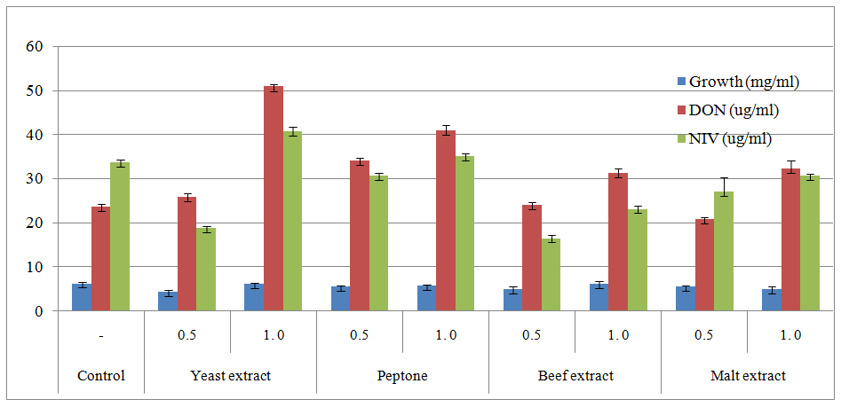 Fig. 6: Influence of microbial nutrients on growth, DON and NIV production by F. culmorum