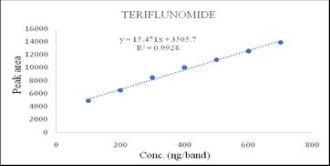 The calibration curve (fig. 3) was plotted between peak areas versus concentration. The linearity of TEF was constructed by applying 7 bands in the concentration range of 100-700 ng/band. The regression equation (r2= 0.9928) demonstrated the good linearity of the method. The slope and intercept of the regression equation were 15.471 and 3505.7 respectively for TEF. The linearity was found to be satisfactory and reproducible. The calibration curve of linearity and overlay densitogram of TEF is depicted in fig. 3 and 4 respectively.