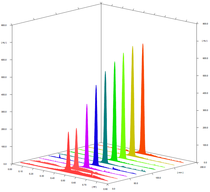 Intraday and interday precision of the method was assessed by developing the plate after application of 6 replicates of the highest concentration on the TLC plate on the same day and the consecutive day respectively. Precision was reported in terms of %RSD. The %RSD values were found to be less than 2% as depicted in table 3, indicating the high precision of the developed method.