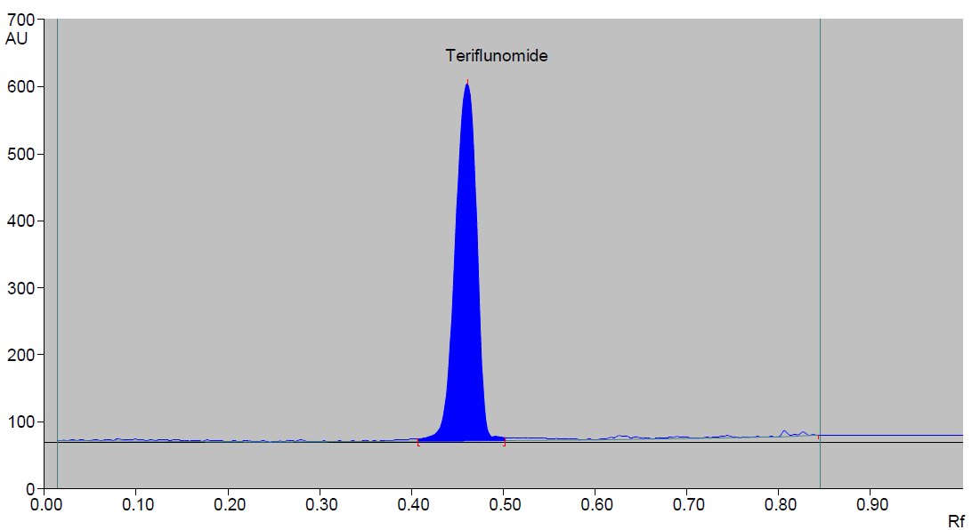 Objective: The current work is intended towards the development of a novel, simple and precise high-performance thin layer chromatographic (HPTLC) method coupled with a densitometer for the estimation of teriflunomide (TEF) present in the marketed formulation.