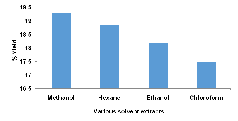 Extraction involves the use of an inert solvent which actively separates the molecules from the plant’s parts. The extracts obtained with various solvents (Methanol, Ethanol, Hexane, and Chloroform) were weighed and their percentage yields were calculated as compared to the initial weight of the plant material, to get the extractive values. The present study revealed that the extraction yield of methanol (19.30%) showed the highest value, followed by the yields of hexane (18.84%), ethanol (18.18%) and chloroform (17.49%) The influence of nature of solvent and total time of extraction on the percentage extraction yield is shown in the fig. 1.