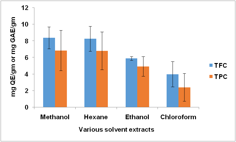 In the determination of total phenolics and flavonoids, the results showed that the methanol solvent was better than other solvents to extract these compounds (fig. 2) which may be explained by its good polarity and solubility for phenolic compounds extracted from plants. The solvent with a low polarity such as chloroform showed much lower capacity for extracting phenolic and flavonoid compounds. The methanol extract contains highest amounts of both (TFC 8.39±1.31 mg QE/gm; TPC, 6.85±2.43 mg GAE/gm) followed by Hexane (TFC 8.27±1.49 mg QE/gm; TPC, 6.82±2.26 mg GAE/gm), followed by ethanol extract (TFC 5.9±0.23 mgQE/gm; TPC, 4.94±1.20 mgGAE/gm) and least in Chloroform extracts (TFC 4 mg±1.52QE/gm; TPC, 2.41±1.67 mg GAE/gm). Order of TFC and TPC among different solvents were in the order as Methanol>Hexane>Ethanol>Chloroform.