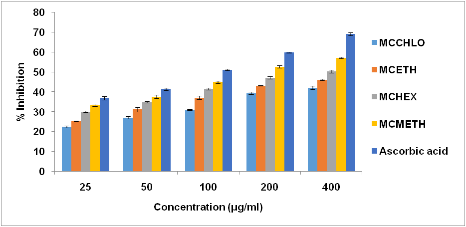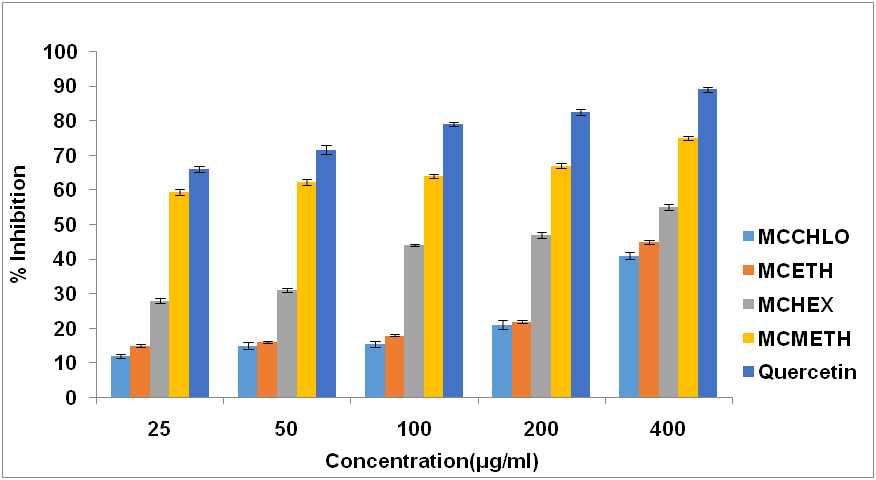 The free radical scavenging activity of the various extracts of M. champaca leaves has been tested by DPPH radical method using Quercetin as a reference standard. The concentration ranged from 25-400μg/ml (fig. 3). DPPH is a very stable free radical. In the case of Methanol extract and other extracts, 400µg/ml concentration showed maximum DPPH radical scavenging activity followed by 200µg/ml, 100µg/ml, 50µg/ml and 25µg/ml.