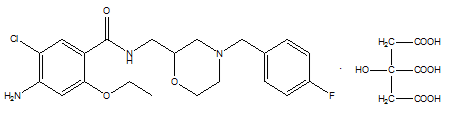 Mosapride citrate is chemically (RS)-4-amino-5-chloro-2-ethoxy-N-[(4-(4-fluorobenzyl) morpholin-2-yl)methyl]bezamide citrate (fig. 2). Mosapride is a gastro pro-kinetic agent that acts as a selective 5HT4 agonist. The major active metabolite of Mosapride is known as M1, additionally acts as a 5HT3 antagonist. In addition to its pro-kinetic properties, Mosapride also exerts anti-inflammatory effects on the gastrointestinal tract which may contribute to some of its therapeutic effects.