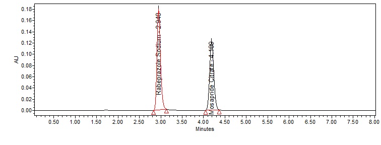Results: The retention times of Rabeprazole sodium and Mosapride citrate were 2.951 min and 4.195 min, respectively. Correlation co-efficient for Rabeprazole sodium and Mosapride citrate was found to be 0.9999 and 0.9999, respectively. The proposed method was validated with respect to linearity, accuracy, precision, specificity, and robustness. Recovery of Rabeprazole sodium and Mosapride citrate in formulations was found to be in the range of 97-103 % and 98-102 %, respectively confirms the non-interferences of the excipients in the formulation.