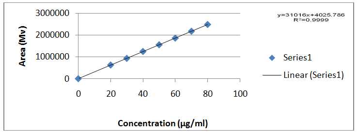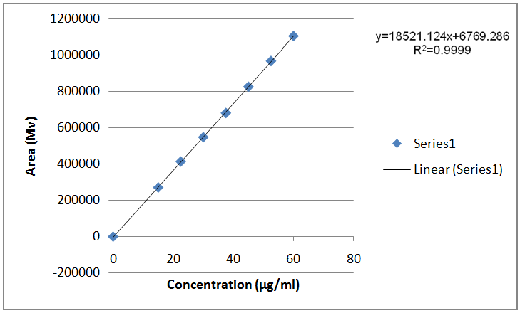 The retention time of standard and sample solution of Rabeprazole sodium and Mosapride citrate were found to be almost same. Moreover, the blank solution and placebo solution doesn't produce any peak. Hence the proposed analytical method is specific for the simultaneous estimation of Rabeprazole sodium and Mosapride citrate. The linearity for HPLC method was determined at six concentration levels ranging from 20-80 µg/ml for Rabeprazole sodium and 15-60 µg/ml for Mosapride citrate. The calibration curve was constructed by plotting response factor against respective concentration of Rabeprazole sodium and Mosapride citrate. The plots of peak area Vs respective concentration of Rabeprazole sodium and Mosapride citrate were found to be linear in the range of 20-80 µg/ml and 15-60 µg/ml with coefficient of correlation (r2) 0.9999. The linearity of this method was evaluated by linear regression analysis. The slope and intercept calculated for Rabeprazole sodium and Mosapride citrate were given in fig. 5 and fig. 6.