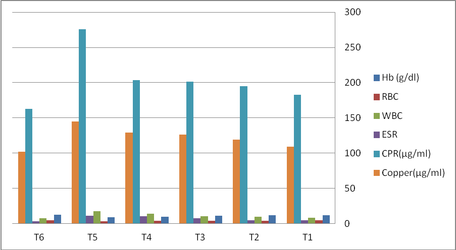 Hematological parameters taken for this experiment(Hb, RBC count, WBC count, ESR, C-reactive protein level and serum copper levels) are shown in (Figure 3).