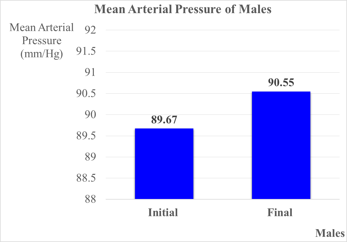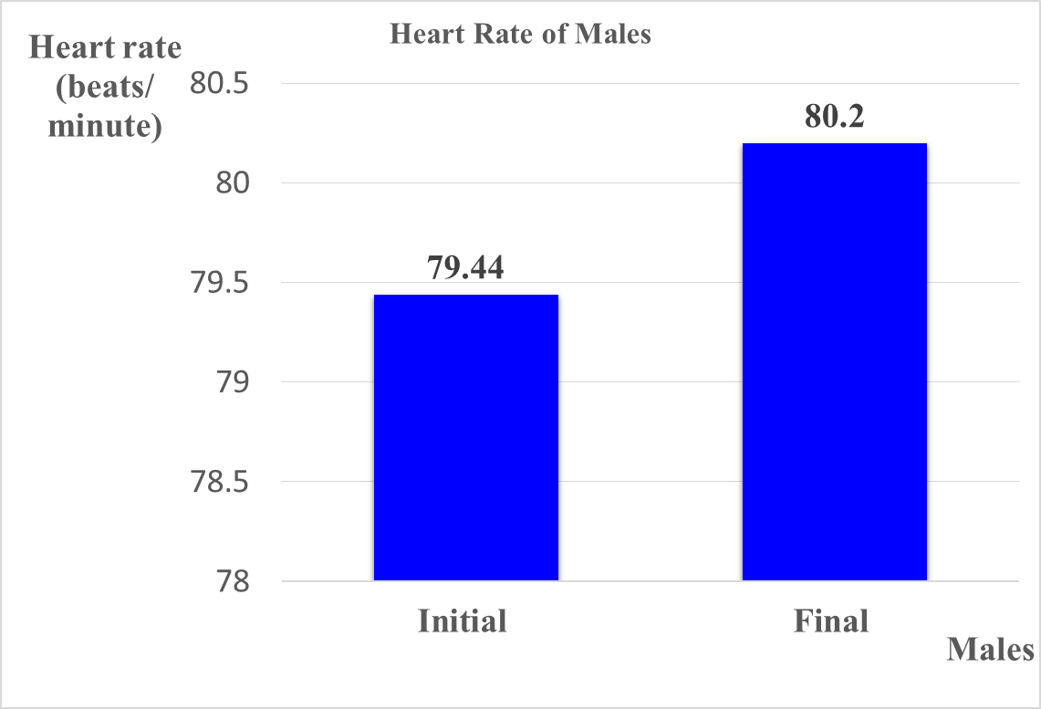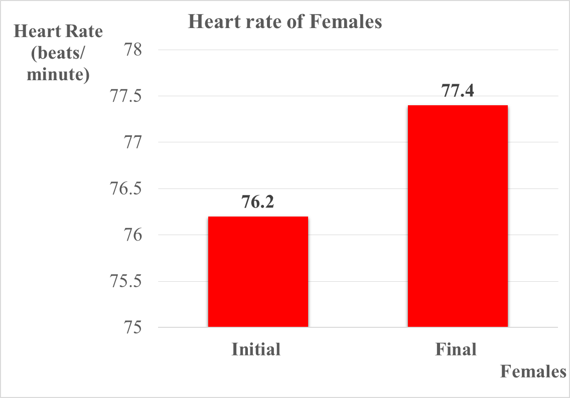 The statistical analysis suggest that, there was 0.88±0.10 mm/Hg increase in the mean arterial pressure, subsequent to the consumption of the aerated drink in the male student population and 2.85±0.18 mm/Hg in the female student population. Similarly, 0.76±0.03 beats/minute increase in the heart rate in male population and 1.2±0.05 beats/minute was observed in female population. Increase is slightly more in female population but it is statistically insignificant (fig. 2, 3).