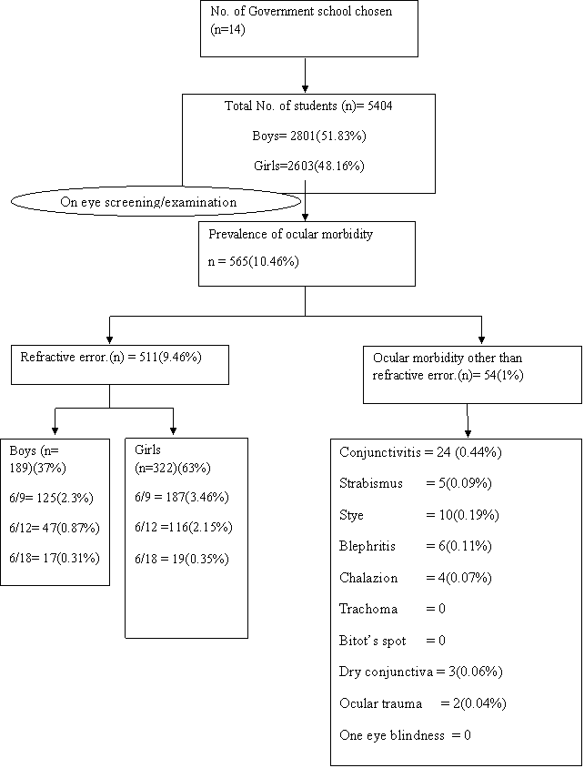 According to the definition used by WHO, visual acuity in the better eye <6/18 was considered as low vision and <20/200 as blindness. A cut-off of <6/9 in either eye was used to define abnormal vision. Children with vision <6/9 in either eye were referred for refraction12. These students were motivated to discuss the issue at home and get a written consent from their parents for refraction test. They were referred to Government Medial College and Hospital-32 for refraction. Those who did not undergo refraction were interviewed to assess reasons for non-compliance. Other associated eye disorders were also diagnosed. Follow up of students was done in one fourth of schools.