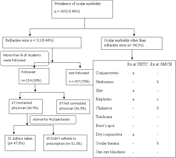 Conclusion: Low compliance with ocular morbidity was evident as less number of students contacted the eye health physician even after being referred. There is a need to spread awareness pertaining to eye health that can be using local media or by health care workers. More over emphasis has not only to be on therapeutic aspect but prevention too has to be given importance.