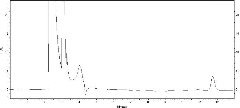 Initial runs were performed using similar mobile phases and internal standard as those used by other authors [3,9-13,16-18]. With the initial use of a mobile phase (MP) made up with phosphate buffer, pH 3/acetonitrile at a 98:2 ratio, phosphate crystals precipitation was observed. Therefore, to prevent collapse and damage of the column we substituted phosphate buffer pH 3 by sodium acetate buffer pH5, in the MP. This new MP was tested at various proportions, ranging from 90:10 to 99.5:0.5, using various flows and gradients.