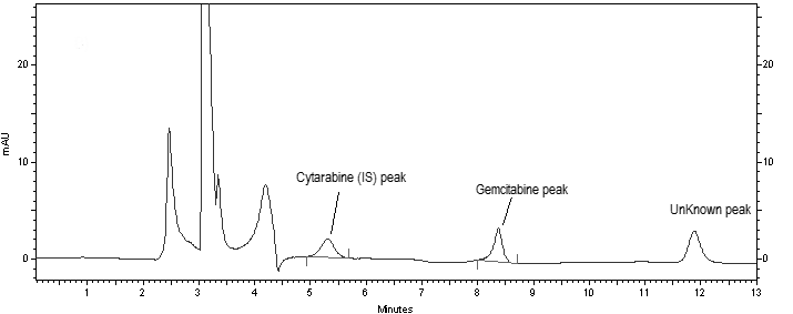 The quantification of gemcitabine plasmatic concentrationsusing an HPLC-UV method was previously described by others authors [3,9-13,16-18]. Nevertheless, we verified in our laboratory the existence of complex steps to the sample preparation, resulting in high costs and unnecessary time consumption. Further more the application of those protocols under our laboratory conditions resulted in non-satisfactory chromatograms, in terms of selectivity, accuracy and precision.