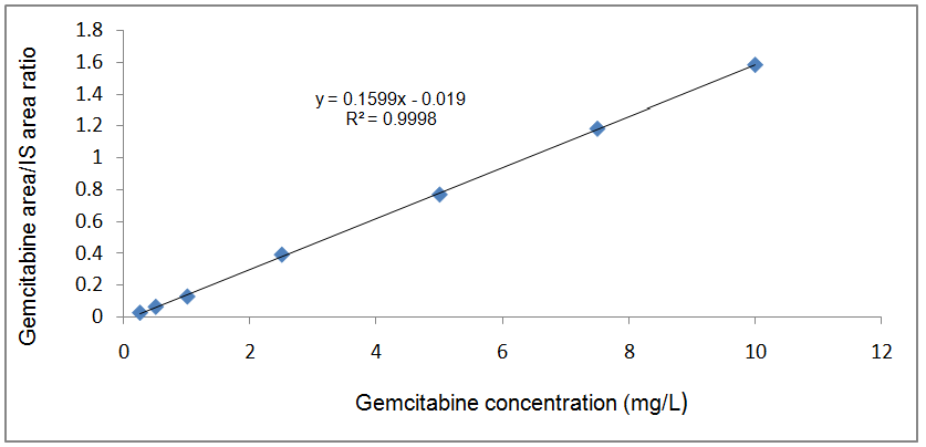 A seven-point calibration curve was constructed by plotting the ratio of gemcitabine/IS peak areas (y) versus gemcitabine concentration (x) (carried out in triplicate) The concentration range for the calibration curve (0.25 to 10 mg/L) was defined according to the expected gemcitabine plasma concentrations [16,17]. Results for blank samples were not used as part of the calibration curve [21]. Gemcitabine standard solutions concentrations were then back calculated,using the calibration curve, and mean accuracy values were determined.