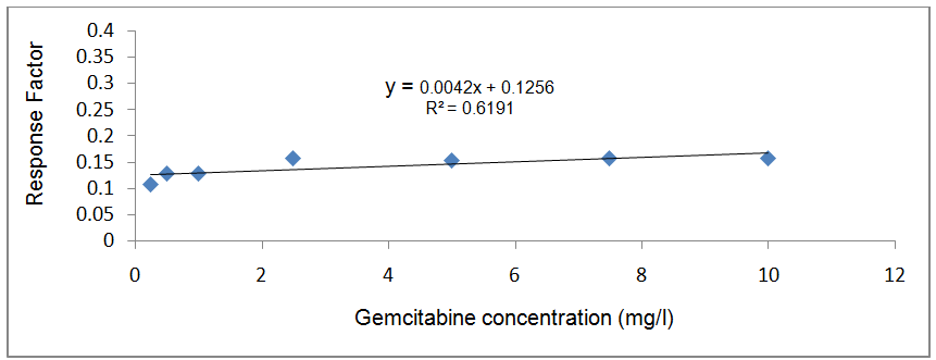 Fig. 5: Linearity studies for the proposed HPLC method: response factor versus gemcitabine standard solutions concentration (N=7).