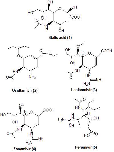 Fig. 1: Chemical structures of Sialic acid 1, Oseltamivir 2, Laninamivir 3, Zanamivir 4, and Peramivir 5