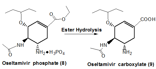 Fig. 3: Chemical structures of Oseltamivir phosphate 8 (prodrug) and Oseltamivir carboxylate 9 (active metabolite)
