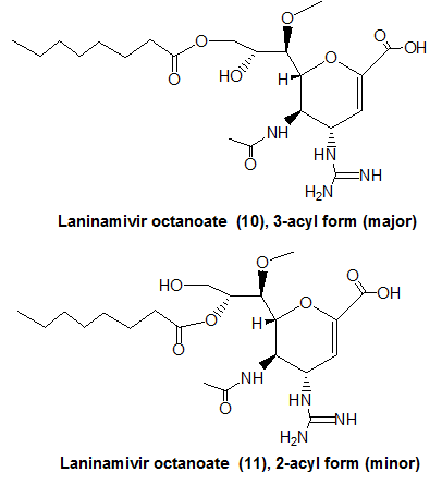Fig. 4: Chemical structures of Laninamivir octanoate 3-acyl form 10 and 2-acyl form 11