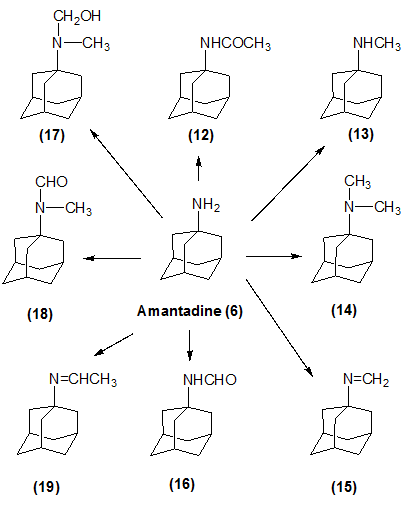 Amantadine 6 is a very important drug as M2 proton channel inhibitor for influenza A. Symmetrel is the brand name normally used for amantadine. Its rate of absorption is high for young people compared to elder independents. Renal insufficiency does not appear to affect absorption, nor does the formulation used. First relative bioavailability studies of the oral administration reported that 86% recovery of the original dose (2–4 mg/kg) within 96 h from urine samples of five healthy men [51]. In case of ingestion after 72 h, 105 mg (52.5%) of the original dose was found in old man (84 y) urine [52]. Eight metabolites originated during metabolism. Besides the major metabolite produced by N-acetylation which is N–acetylamantadine 12; other metabolites were observed. These are N–methylamantadine 13, N–dimethylamantadine 14, N–methyleneamantadine 15, N–formylamantadine 16, and metabolites 17, 18 and 19 (fig. 5) [53].