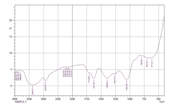 The peak at 3989 and 3385.07 cm-1 is corresponding to hydrogen - bonded O-H stretching frequency respectively. The peak at 3385.07 cm-1 that peak covers the entire region with a very broad peak. The peak at 2929.87 cm-1 to assign H-C-H stretch. The peak at 2223.92 cm-1 to assign C≡N stretch. The absorptions can be seen as several distinct peak in this region. The bands between 3000 and 2800 cm-1 represent C-H stretching vibrations that are mainly generated by lipids [8,9]. The more intense bands occurring at 2200.78, 2181.49, 2152.56, 2133.27 corresponding to C≡C stretching indicate the presence of alkynes. The peak at 1710.86 cm-1 to assign C=O stretching indicate the carboxylic acid. The peak at 1627.97 cm-1 to assign C-C=C stretching indicate the alkenes.