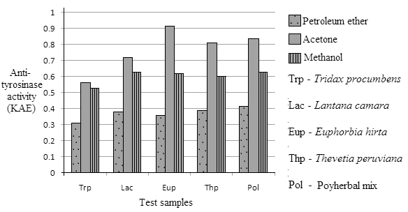 It was observed that the highest anti-tyrosinase property possessing plant extract is acetone extract of Euphorbia hirta (0.91 KAE). Lowest anti-tyrosinase activity was noted in petroleum ether extracts of Tridax procumebens (0.31 KAE). Tyrosinase inhibition by the plant extracts increased in the following order: acetone extracts > methanol extracts > petroleum ether extracts.