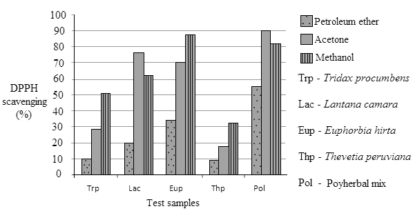 The anti-oxidant activity expressed by polyherbal mix was compared with that of individual plant extracts in Fig. 2. The bar chart clearly shows additive anti-oxidant activity of polyherbal mix which outwits the anti-oxidant activity of individual plant extracts from petroleum ether, acetone and methanol. Therefore, synergistic effect has been recorded for anti-oxidant activity