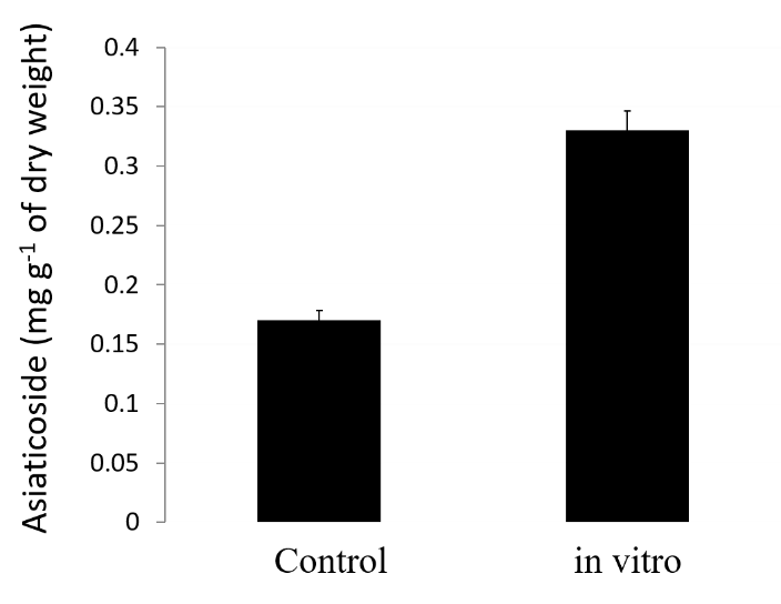 The present study shows a direct correlation between oxidative stress and transcript/phytochemical estimation of asiaticoside content under in vitro conditions. It is evident in most of the reports that asiaticoside production is more enhanced in a growth-correlated manner, which was evidenced by the augmented cytokinin and auxin levels.