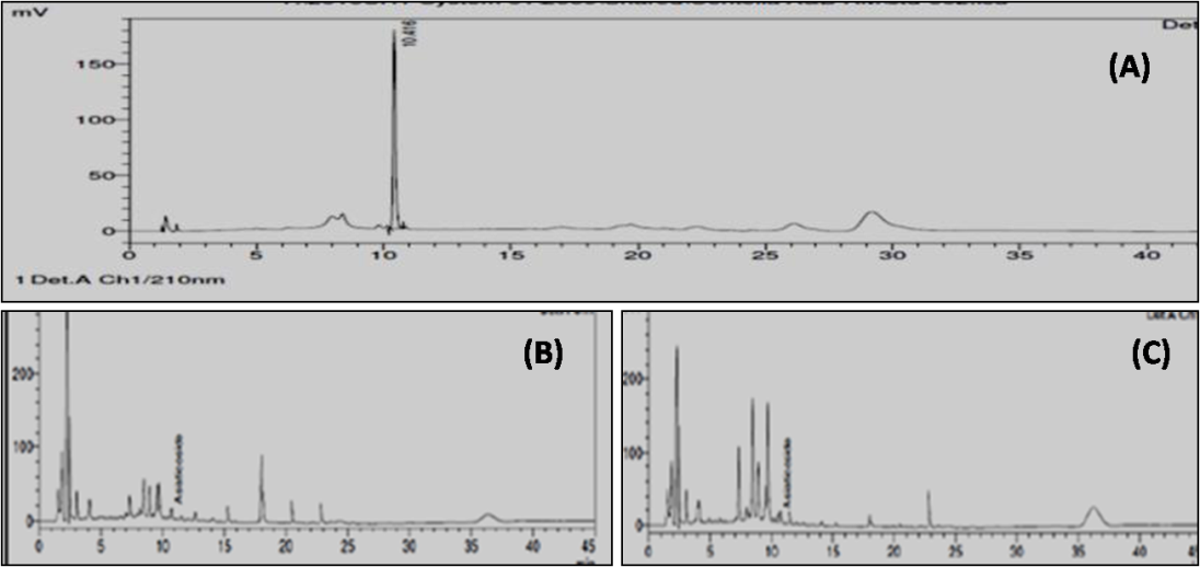 Supplementary material 1: HPLC chromatograms for the asiaticoside standard (A), in vivo (B) and in vitro (C) grown C. asiatica