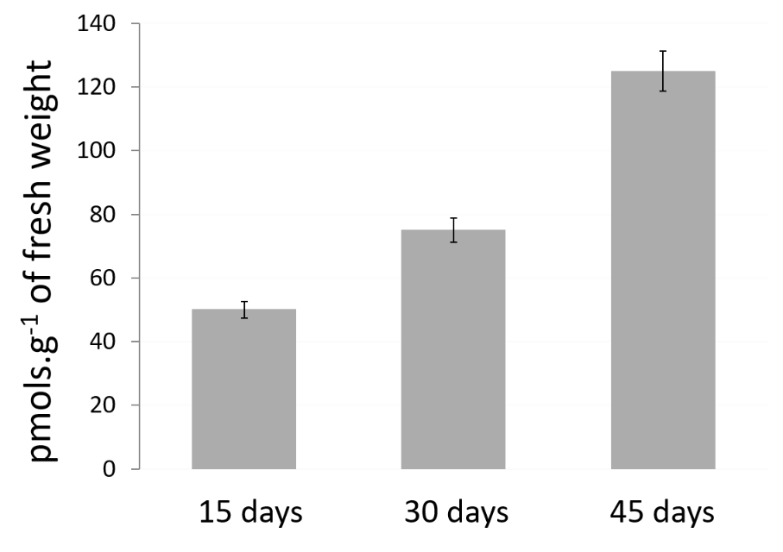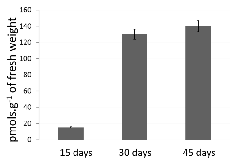 Fig. 2: Quantification of auxin in the leaves of C. asiatica. Estimation of the endogenous levels of hormone auxin-IAA in the leaves of in vitro grown C. asiatica plants at 15, 30 and 45 d interval. The values are mentioned in mean±SD. Number of samples in the experiment=3