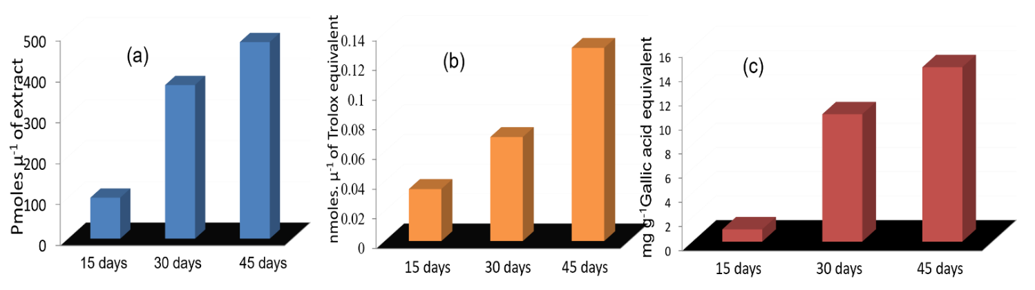The production of H2O2 after 15 d was 100 pmol µl-1of extract which was drastically boosted to a level of 480 pmol. µl-1of extract in 45 d was significantly relevant (P<0.001 fig. 4a). 30 d also showed a significant enhancement (P<0.001) of 370 pmol µl-1 of extracts (fig. 4a). The standard graph obtained is also provided. Total antioxidant capacity of host plants was calculated after 45 d of in vitro culture. TAC was calculated in terms of nmol µ-1of Trolox equivalent. The total antioxidant capacity of host plants was affected by in vitro cultivation, even though the change was not significant (P>0.05) (fig. 4b). The antioxidant capacity showed an increase from 15-45 d (from 0.035 to 0.13 nmol. µ-1of trolox equivalent respectively) with no significant change (fig. 4b). The standard graph obtained is also provided. The total phenolic content recorded in 15, 30 and 45 d of C. asiatica in vitro cultures were 1.01±0.056, 10.52±0.05 and 14.4±0.06 respectively (fig. 4c). A significant enhancement in total phenolics (P<0.001) was observed and maintained a significant level even after 45 d. The standard graph was prepared for the estimation of total phenols.