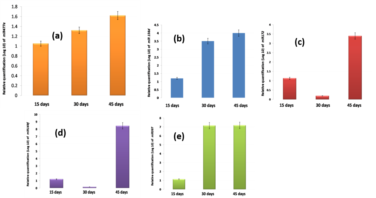 Environmental stress like the limited aeration and nutrients can cause the plants to upregulate or downregulate certain miRNAs or to synthesize new miRNAs to cope with stress. For the present study, five miRNA specific primers were selected which are involved in plant stress responses directly or indirectly. The differential expression profiling was carried out using all these five miRNAs in a time-dependent manner (from 15 d to 45 d). 5.8S rRNA was selected as the internal control for the analysis of differential expression profiling in miRNAs. The relative expression level of miRNAs were calculated using CT and 2-ΔΔCT method. 2-ΔΔCTor the fold change values which are greater than 1 represents upregulation of miRNA and less than 1 indicates downregulation of miRNA. Among the five primers used, significant gradual upregulations (P<0.001) were shown by miR477e (fig. 5a), miR156d (fig. 5b) and miR397 (fig. 5c) from 30 to 45 d in comparison to 15 d old in vitro culture. The expression profiling of miR169f and miR172 showed an entirely different pattern. An initial non-significant down regulation (P>0.05) in 30 d followed by a significant upregulation (P<0.001) was visualised in both miR172 (fig. 5d) and miR169f (fig. 5e).
