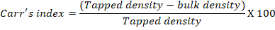 It is also one of the simple methods to evaluate flow property of powder by comparing the bulk density and tapped density is calculated by the following formula [25-27]. The outcomes are given in the table 12