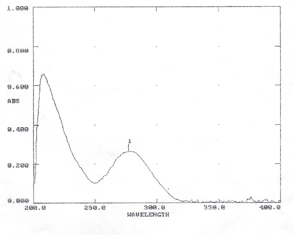 Scanning: From the stock solution (stock A) pippet out 1 ml and was make up to 10 ml to give a concentration 100μg/ml (stock solution B) was prepared and UV scan was taken between 200 to 400 nm. The absorption maximum was found to be 270 nm and was used for further analytical studies [9, 10].