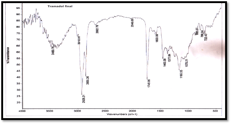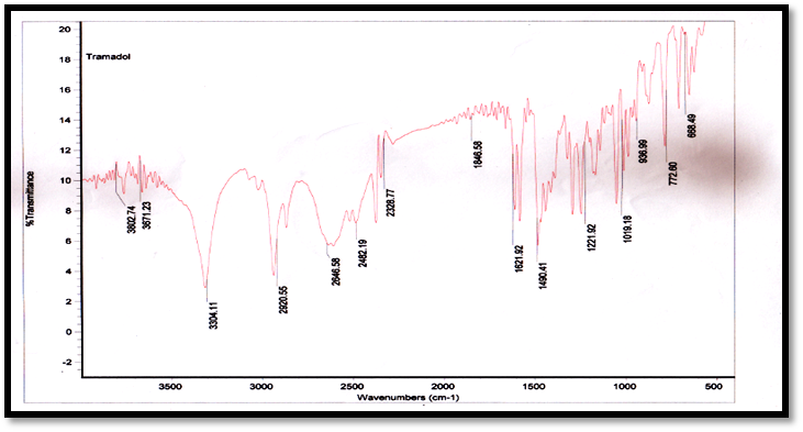 Infrared spectroscopy is a useful analytical technique utilized to check the chemical interaction between the drug and excipients used in the formulation.1-2 mg of solid fine powder of drug tramadol and 200-300 mg of dry powder of KBr (IR grade) were taken in a mortar and mixed well with the help of a spatula. Spectrum measurement was carried out using KBr disk method in the wavelength region of 4000-400 cm-1 by FTIR spectrophotometer [15-16]. The IR spectrum of the physical mixture was compared with that of the pure drug to check any possible drug-excipient interaction. The spectrum of FT-IR is shown in fig. 4 and 5.