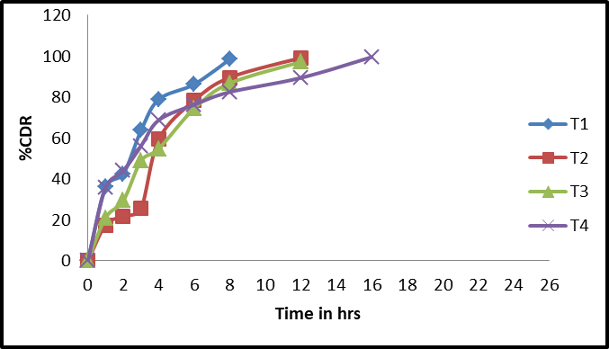 | Time (h) | T1(% of drug release)* | T2 (% of drug release)* | T3 (% of drug release)* | T4 (% of drug release)* |