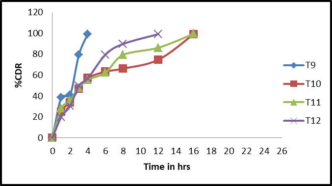 | Time (h) | T9(% of drug release)* | T10 (% of drug release) | T11(% of drug release)* | T12(% of drug release)* |