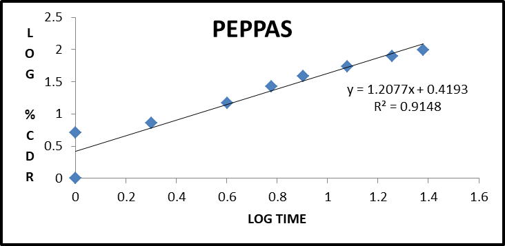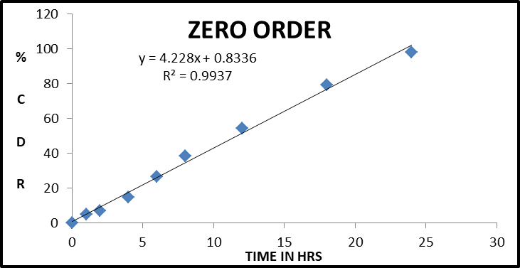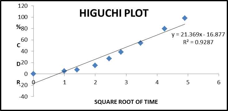 For analyzing the release mechanism, the data obtained were fitted to various kinetic equations of Zero order, First order, Higuchi model and Korsmeyer-Peppas model. The regression coefficient was calculated. It was concluded that the optimized formulations T6 follows zero order kinetics as correlation coefficient (r2) values are higher than that of first-order release kinetics. In order to understand the complex mechanism of drug release from the matrix system, the in vitro release rate were fitted to korsmeyer-peppas model and interpretation of release exponent value (n) enlighten in understanding the release mechanism from the dosage form. The release exponent value (n) obtained was 0.82105. The T6 formulation exhibited anomalous (non-fickian) diffusion mechanism. Kinetic studies shows that the amount of drug from the matrix system was by both diffusion and erosion. There is a good scope for the development of extended-release tablets for this drug. The data of the regression coefficient of different kinetic models were summarized in table 17.