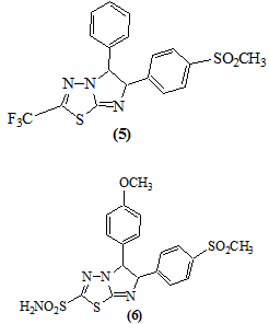 Gadad et al.4 have synthesized a series of 2-trifluoromethyl/ sulfonamido-5,6-diarylsubstituted imidazo[2,1-b]-1,3,4-thiadiazole derivatives. They found that the compounds 5 and 6 have shown selective inhibitory activity toward COX-2 (80.6–49.4%) over COX-1 (30.6–8.6). These compounds also exhibited significant anti-inflammatory activity (70.09–42.32%), which is comparable to that of celecoxib in the carrageenan-induced rat paw edema method.